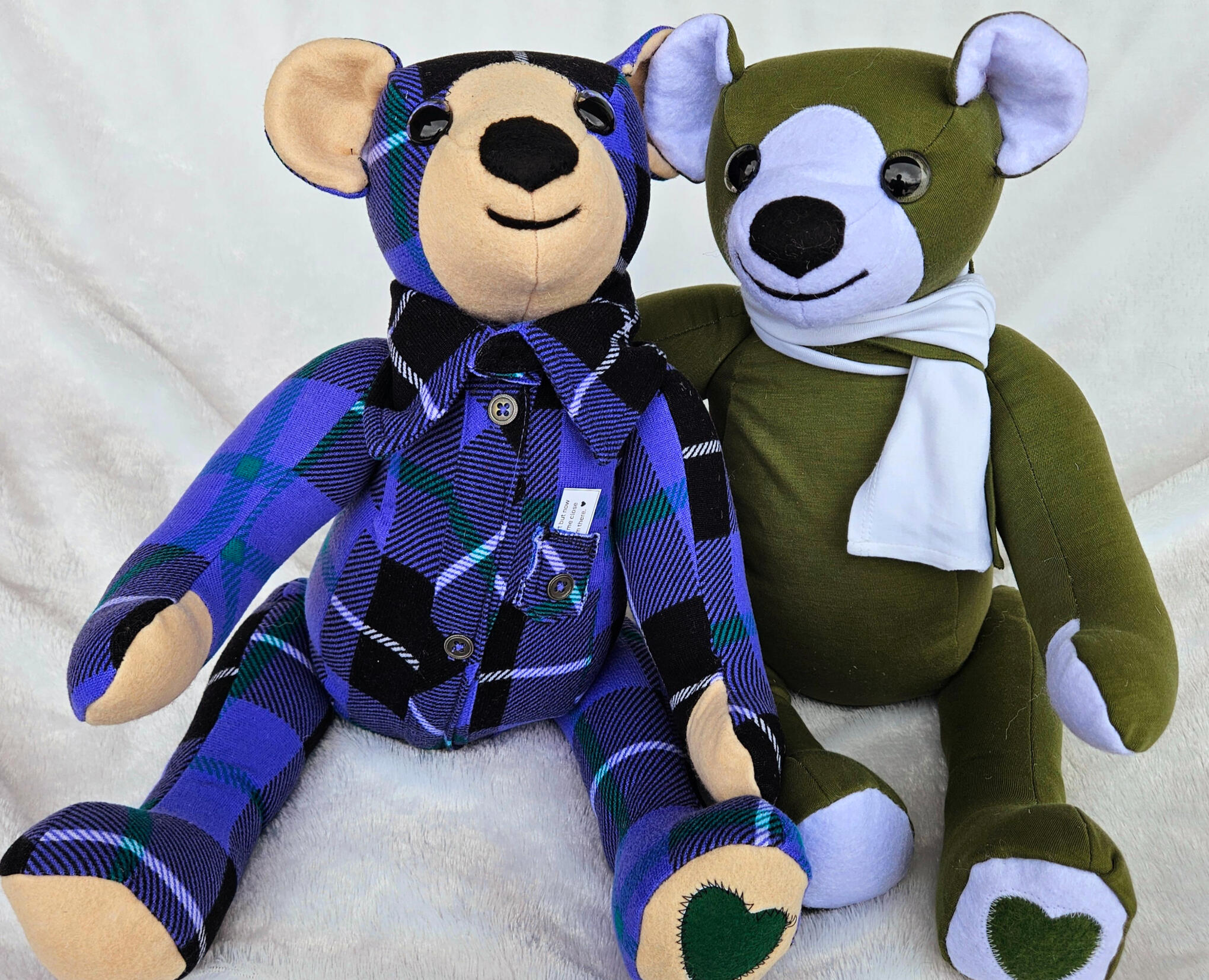 Unlike traditional memory bears, these are made with clothing you choose—something you want your loved ones to remember you in. Scrubs, flannel, a favorite jacket, a uniform… whatever tells your story best.